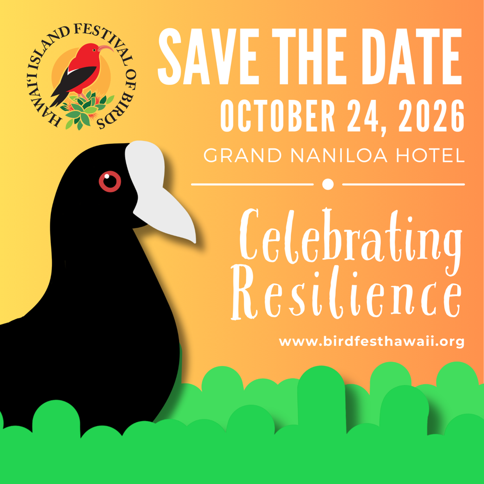The 2026 Hawai‘i Island Festival of Birds is returning to the Grand Naniloa Hotel Hilo on Saturday, October 24, 2026. This full-day, family-friendly festival will include a Bird Fair featuring artists and crafters that highlight native birds in their work as well as conservation nonprofits, guest speakers and Hālau hula, bird trivia, and soundscapes throughout the day. This event is presented by the Hawai‘i Wildlife Center and the Conservation Council for Hawai‘i. Proceeds raised at the festival support the work of these two conservation organizations.